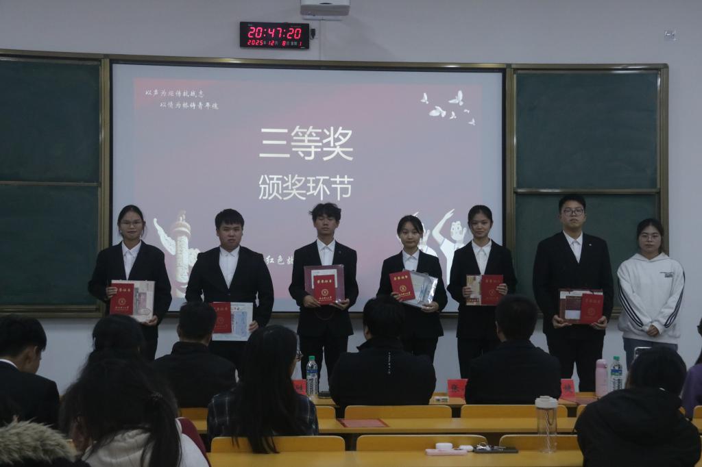 本网讯 12月8日,为厚植青年学生红色情怀,传承红色基因,凝聚青春奋进力量,我院于三江校区(西园)阳明楼107教室举办“以声为炬传抗战志 以情为桥铸青年魂”主题红色故事宣讲大赛。学院学工办主任兼团委书记刘浩,党建组织员张小普,辅导员叶景胜、刘黎明、肖婕等担任大赛评委。